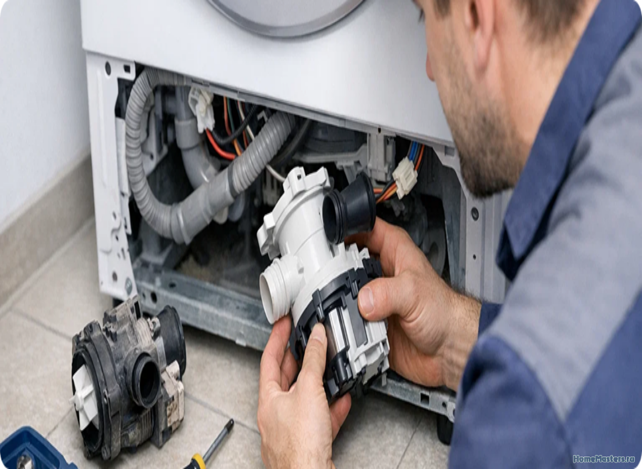 Изношенная или заклинившая помпа не способна удалить воду. Электроника фиксирует её наличие и не даёт двигателю разгоняться.