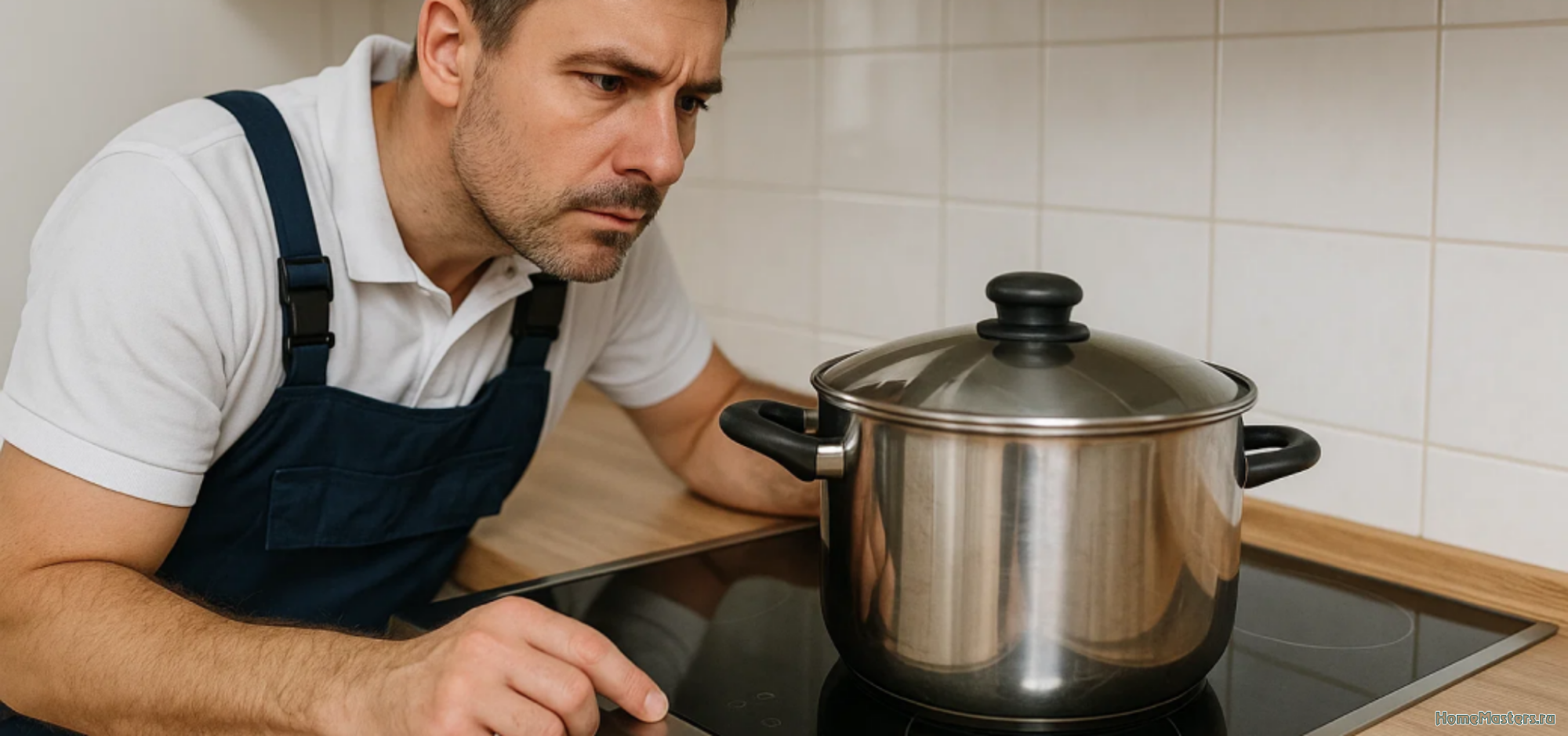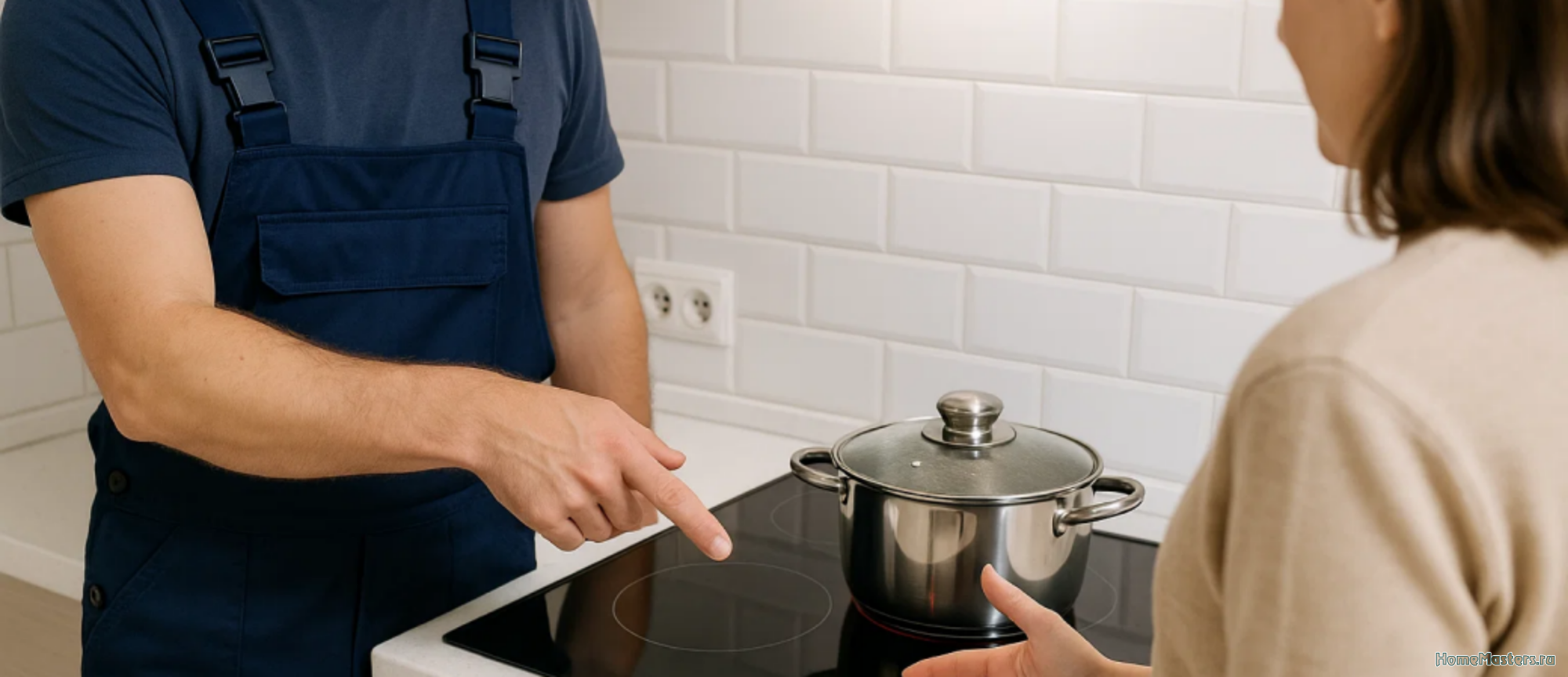 Мастер объяснил, что для работы нужна посуда с ровным ферромагнитным дном, показал тест с магнитом и предложил адаптер-диск как временное решение. После замены кастрюль сбои исчезли.