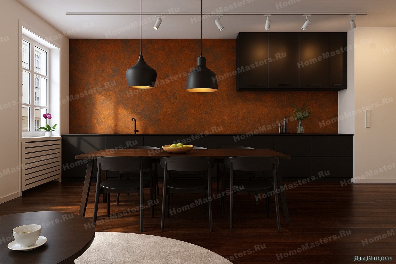Эффект ржавого металла можно использовать как на одной стене, так и в сочетании с другими декоративными материалами. Он удачно подчёркивает мебель из натурального дерева, мягкие диваны, кожаные кресла и металлические светильники. Дополнительную выразительность создаёт локальная подсветка — светильники, направленные на поверхность, подчёркивают фактуру и игру оттенков.