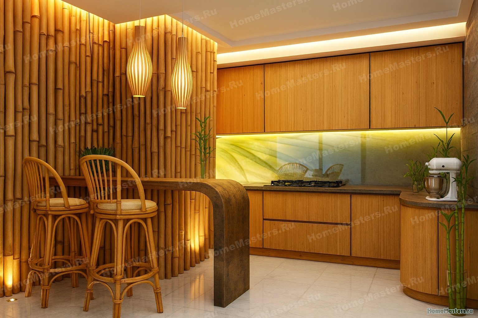 Дополнительный эффект достигается за счёт освещения и текстиля. Мягкий свет подчёркивает рельеф бамбука и ротанга, а льняные или хлопковые ткани усиливают ощущение естественности. В результате интерьер получается не только красивым, но и функциональным, комфортным для повседневной жизни.