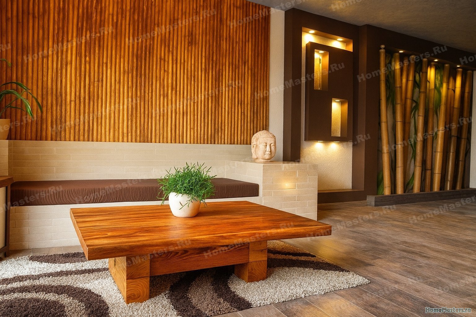 Бамбук также применяют для оформления потолков и декоративных перегородок. Лёгкие рейки позволяют зонировать пространство без потери воздуха и света. Такой приём особенно удобен в квартирах-студиях и небольших помещениях, где важно сохранить простор.