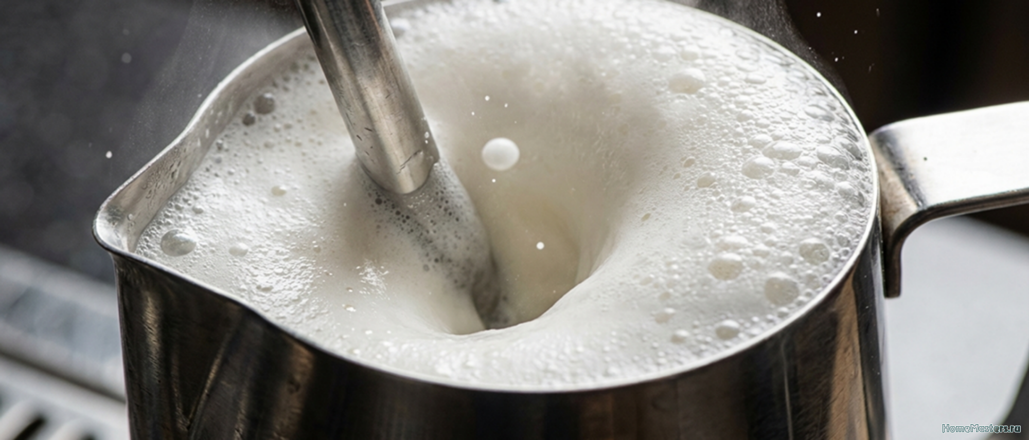 Сначала молоко насыщается воздухом — увеличивается объём. Затем поток закручивает жидкость, дробя крупные пузырьки до мелкой и плотной текстуры.