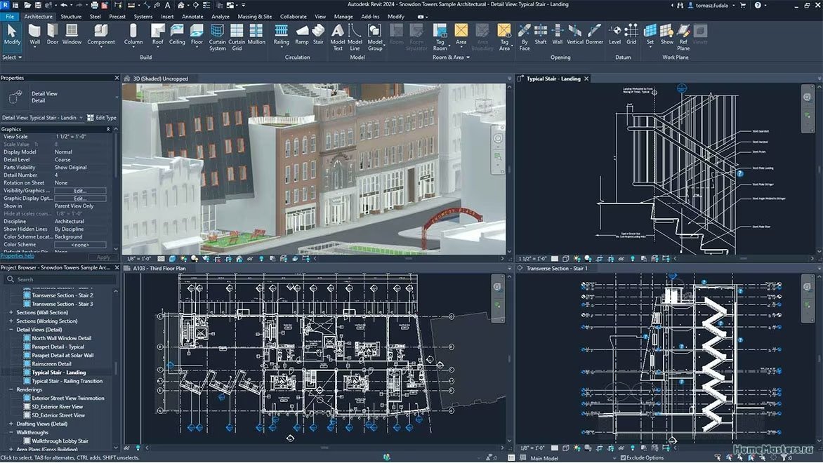 Сильная сторона Revit — автоматическая связность планов, разрезов, фасадов и спецификаций: меняешь модель — обновляется документация. В больших и средних проектах это резко снижает риск ошибок, а также упрощает координацию архитектуры, конструкций и MEP.