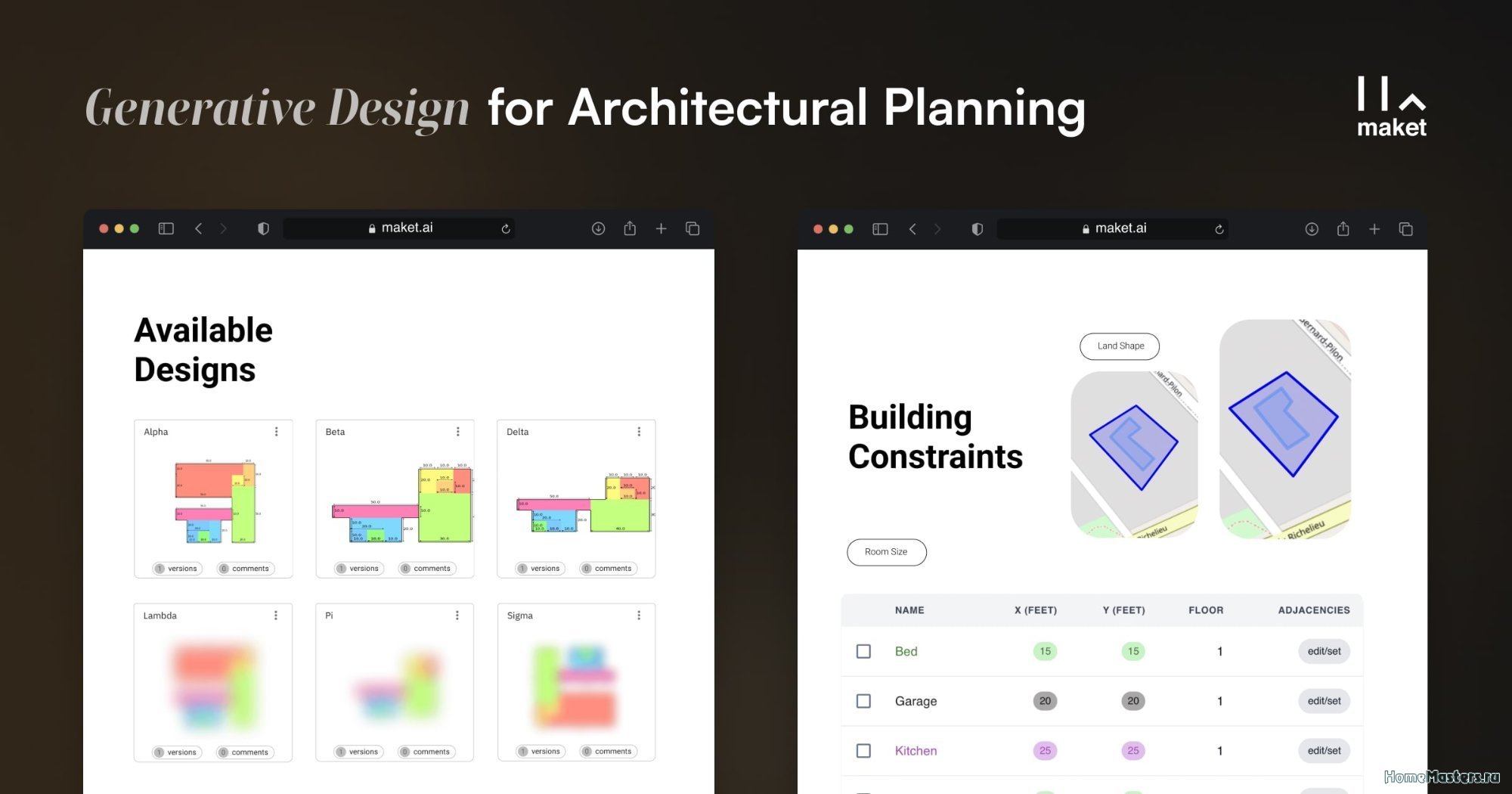 Maket фокусируется на генерации жилых планировок: вместо ручного рисования стен пользователь задает требования (площадь, комнаты, приоритеты), и система создает несколько вариантов. Это удобно на старте, когда нужно быстро «нащупать» рабочую схему.