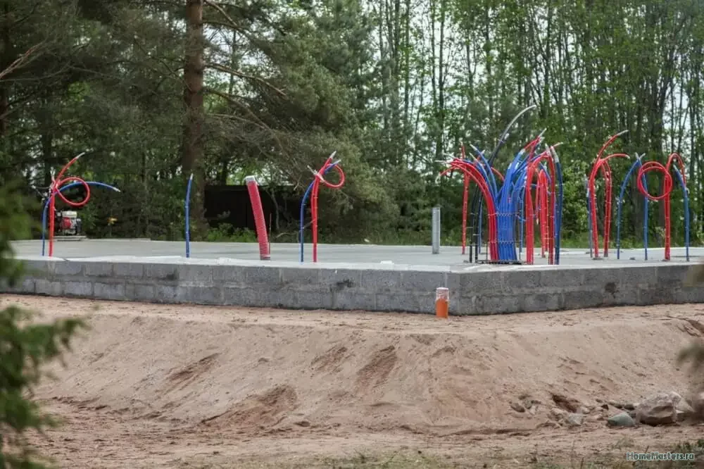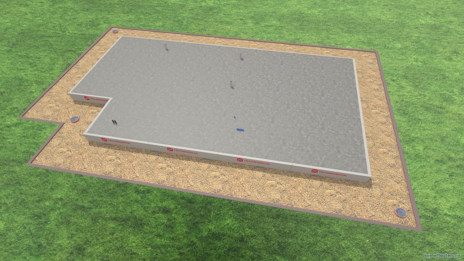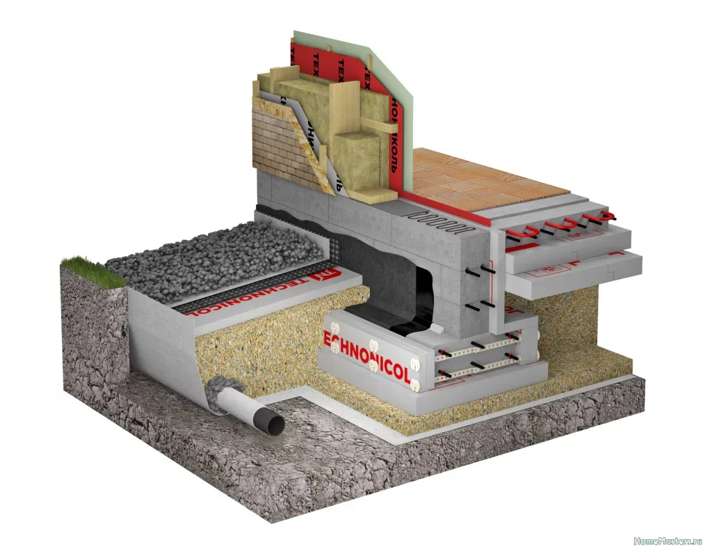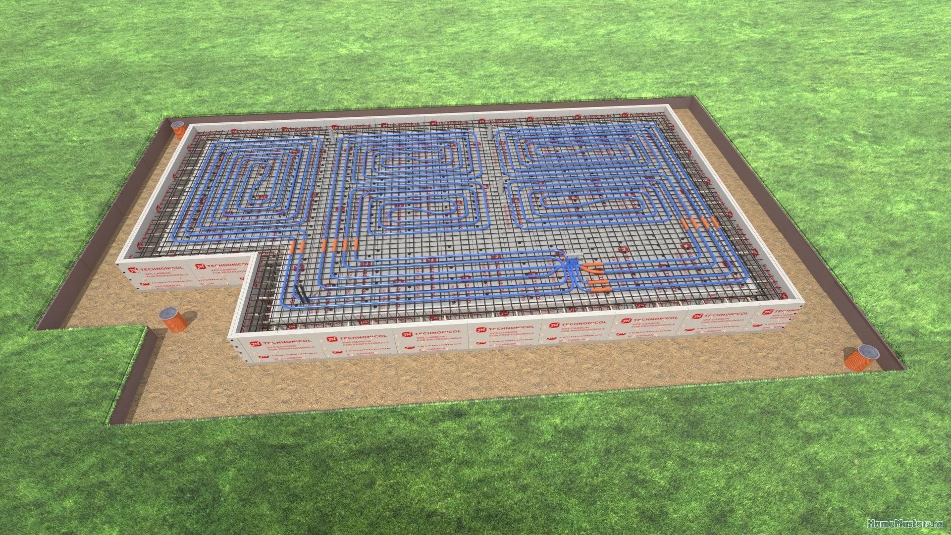 После земляных работ дно котлована отсыпается несколькими слоями щебня по слою геотекстиля, затем — песком. После трамбовки каждого слоя можно приступать к утеплению будущей плиты (или основания ленты). Важно, чтобы утеплитель имел высокую прочность на сжатие, так как на него будет воздействовать нагрузка всей массы дома. Только в этом случае плита заработает правильно: снизу она будет защищена от воздействия влажности и сезонных деформаций грунта, что позволит ей равномерно нагреваться трубами теплого пола.