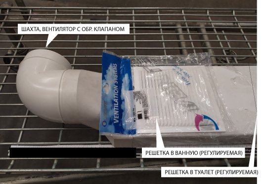 Один вентиляционный люк на ванную и туалет. Эффективная вытяжка.