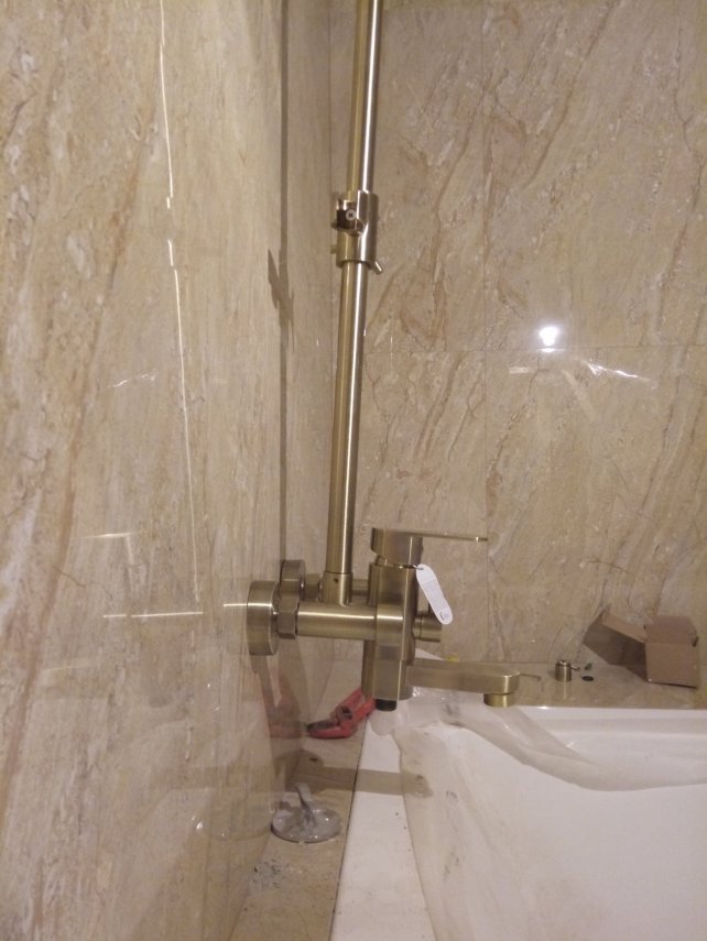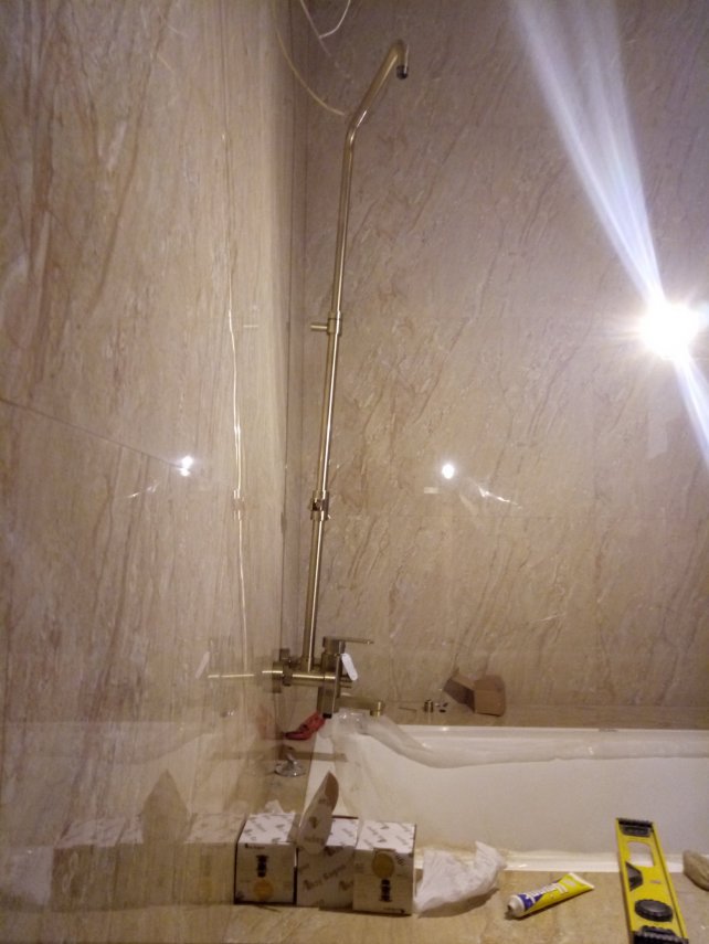 Вот фото заваленных розеток по горизонту. Смеситель установлен и "клюёт" к ванной. Душевая лейка- жёсткая. Крепёж не достаёт до стены!... -