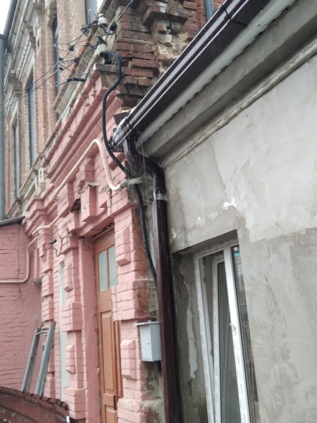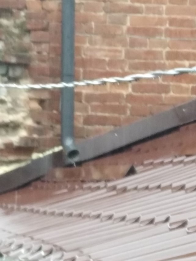 Слив воды из трубы с верхней крыши на нижнюю