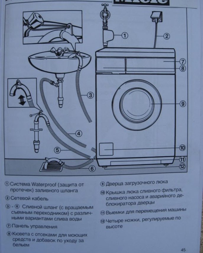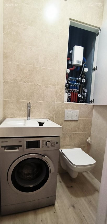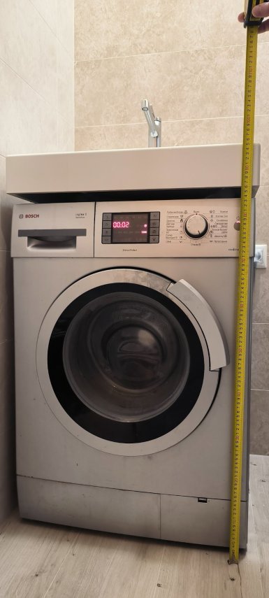 В данной ситуации должно быть такое решение - верх раковины на высоте 950-970мм от пола, при высоте стиралка 850мм, отдельный скрытый сифон для стиралки (он на фото слева) и отдельный вывод слива для сифона для раковины (он на фото справа)...- 7 ответов