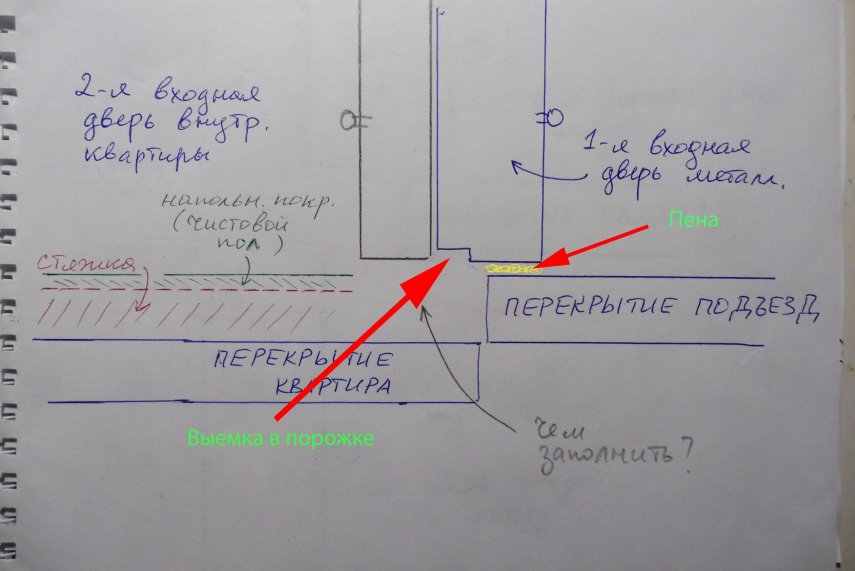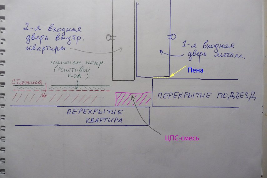 Да, дверные коробки (металлическая внешняя и деревянная внутренняя) стоят вплотную друг к другу. Ну почти вплотную. Первая дверь открывается наружу, вторая вовнутрь квартиры. Но проблема не в этом. Проблема в следующем. Я в первом сообщении нарисовал схему. На схеме видно, что под нижней частью этих дверных коробок - пу... -