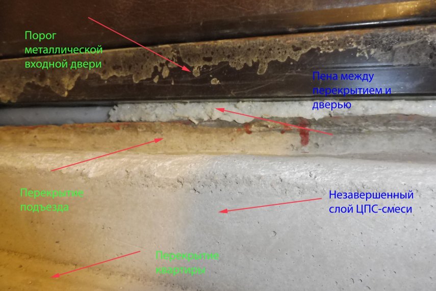 Здравствуйте! В дверном проеме входа в квартиру установлена "двойная" входная дверь: сначала стоит металлическая внешняя дверь, затем деревянная внутренняя дверь. Так получилось, что сейчас под ними просто пустота. Металлическая дверная коробка частично стоит на перекрытии подъезда. А внутренняя деревянная коробка держится только на анкерах, вкру...