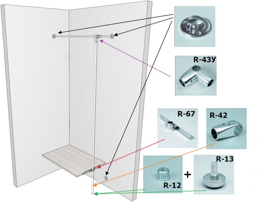 Вот, что вам необходимо. Сверлим насквозь. Зенкуем со стороны "лица". Тремя винтами М4 и гайками прикручиваем фланец для трубы (штанги) к вашей дсп 12мм. Все. Полагаю, раз вешалка открытая, то три шляпки от винтов не так уж испортят картину. Тем более их можно заклеить заглуш...