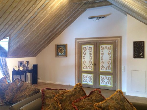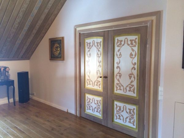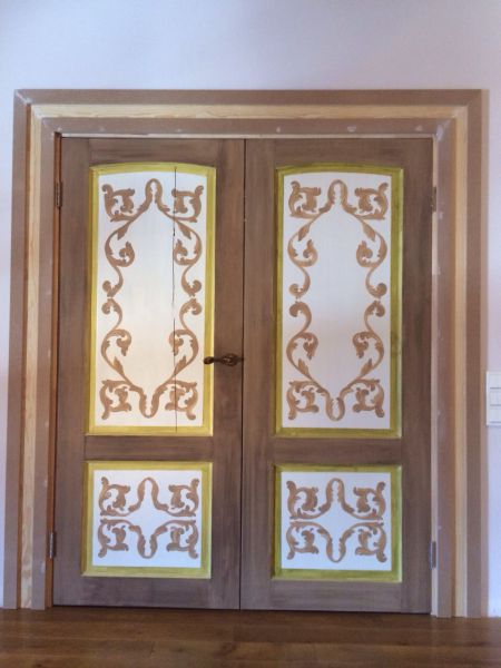 Мне необходимо было задекорировать двери из соснового массива в гостиной комнате. Для того, чтобы закрасить ее желтизну, необходимо нанести белую грунтовку. После того, как она подсохнет, наносится краска светло-коричневого цвета (под орех) марки Sikkens. Затем необходимо подчеркнуть структуру, для этого наносится крас...