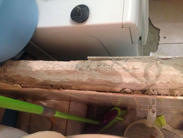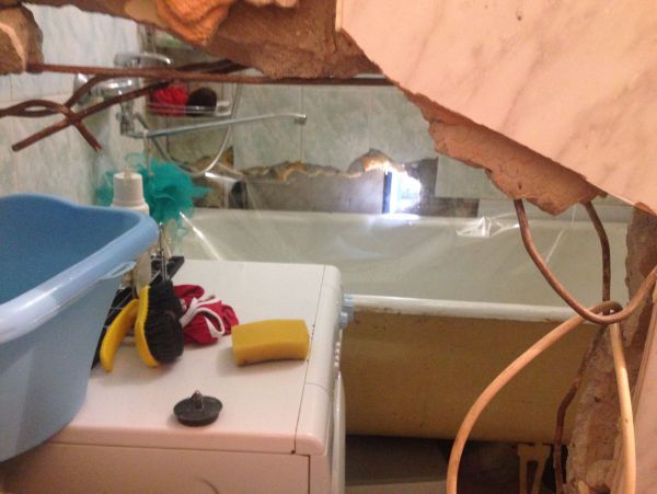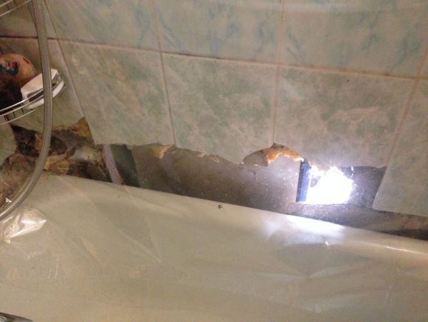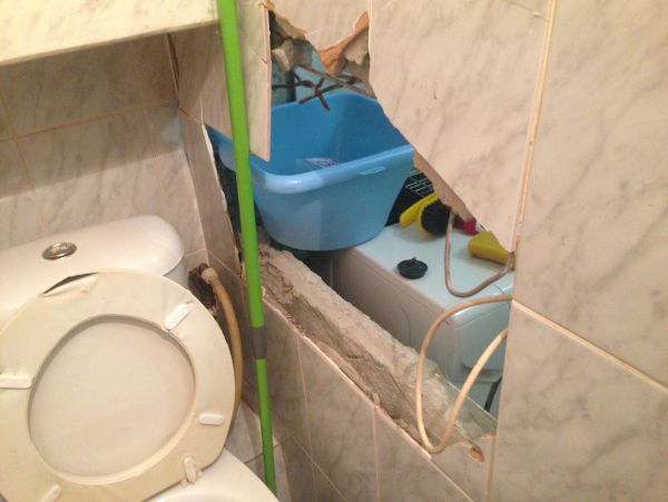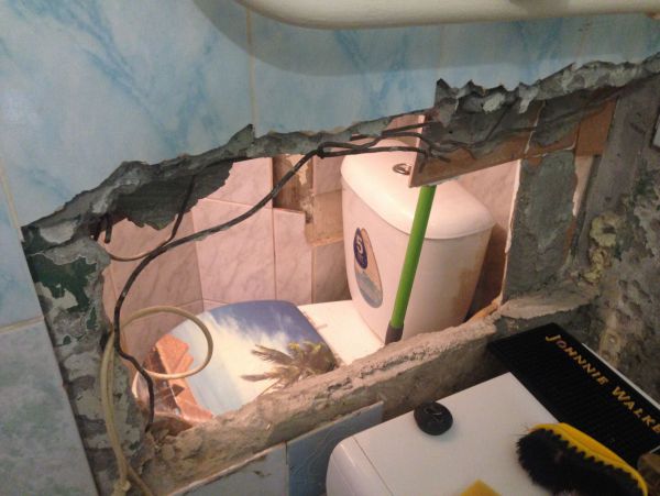 2. Жена очень хотела переставить ванну, к сожалению я согласился! Предыдущие хозяева так хотели переставить ванну что врезали её в обе стены! А затаскивали вероятнее всего с кухни!!! Вот что получилось в конце концов, подскажите как лучше избавиться от этого безобразия?вид из туалетадыра на кухню, она идё...