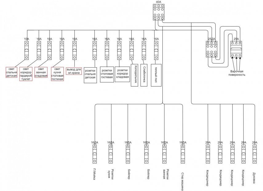 5. Добрый день. Занимаюсь ремонтом своей квартиры квартиры (ну как занимаюсь, сую нос во все процессы). Подошло время электрики в квартире. Набросал схему щитка с разделением по группам. Нужна оценка и комментарии. Из мощных потребителей это 2 бойлера, 4 кондиционера, 1 варочная. Пояснения. ДА...