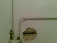 8. Добрый день!С недавних пор появилось посередине стены небольшое мокрое пятно. Раздолбал штукатурку, в этом месте стык бетонных плит, и за ним два соседских воздуховода. Из щели дует, за пару дней пятно сразу высохло.Плюс чуть дальше в стену с той стороны вбита свая, на которой держится лестничная плита в подъе...