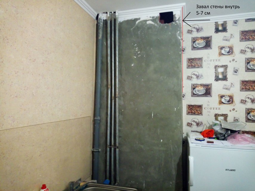 2. Всем привет! Суть проблемы такая- вентиляция на кухне выложена кирпичом буквой Г (фото) завал одной стены сверху внутрь составляет 5-7 см. Что можно делать в этом случае -закрыть гипсокартоном эти 2 стены с трубами (заодно трубы закрыть) и счетчиками или ?? выравнивать не хочу...