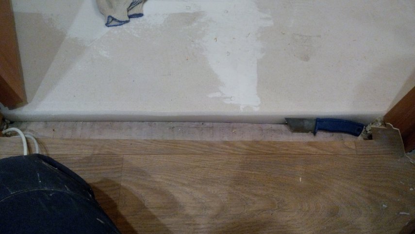 2. Добрый день. Застелил в комнате листы суперпол кнауф, в коридоре остался старый паркет на лагах, не знаю как сделать переход с одного пола на другой в дверном проеме. Что посоветуете? На фото видно Высота полов (с учётом будущего ламината) совпадает...