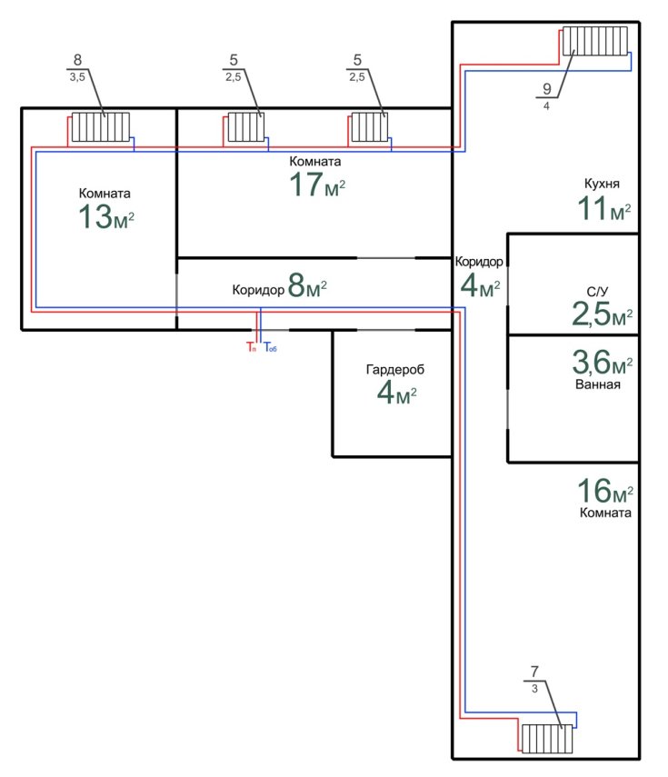 2. Добрый день. Решил заменить батареи от застройщика и арматуру на новые, сделать все по уму. Есть трехкомнатная квартира общей площадью в 79.8м2. Разводка отопления горизонтальная, т.е. в коридоре на этаже есть стояк, от которого после ИПУ тепла, в квартиру идет двухтрубная разводка. От застройщика имеем ...