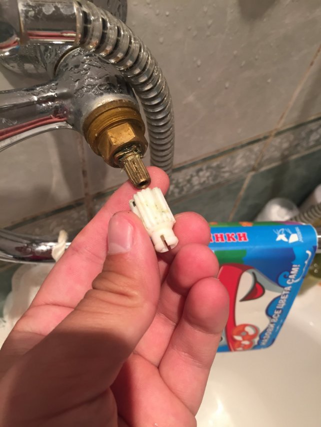 9. Доброго времени суток, в ванной стоит смеситель grohe. Холодная и горячая вода регулируется своим вентилем. Вентиль холодной воды стал прокручиваться, полностью перекрыть холодную воду не получается, остается постоянное капание из носика. Как я понял проблема в том, что белая штука (не знаю как называется), которая надевается на вн...